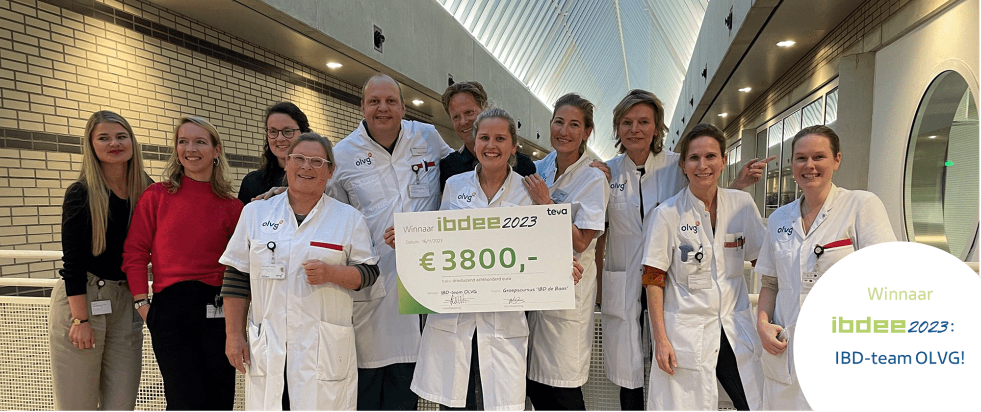 Het IBD-team van het OLVG-ziekenhuis heeft IBDEE 2023 gewonnen! IBDEE is een initiatief van Teva waarbij IBD-afdelingen ideeën kunnen inzenden voor verbetering van de IBD-zorg. Het IBD-team van het OLVG stuurde het idee ‘Groepscursus ‘IBD de Baas’ in. De onafhankelijke jury, bestaande uit Menne Scherpenzeel (patiëntvereniging Crohn & Colitis NL) en Frank Hoentjen (winnaar IBDEE 2020), heeft dit idee uit alle inzendingen als winnaar aangewezen. Zij zien coping - een centraal onderdeel van het idee - als belangrijk onderwerp, waar in de praktijk vaak weinig tijd of FTE voor is.